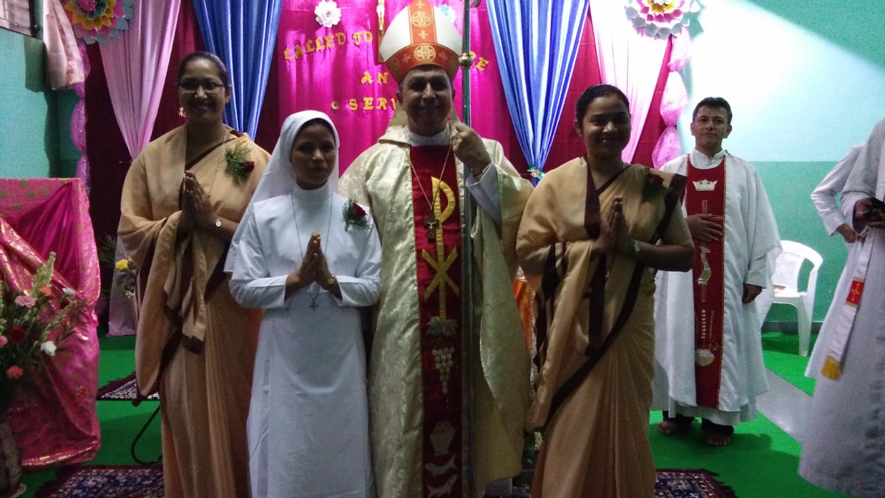 The Newly Professed Sisters onica Sahota, Preska Basumatary (Delhi Province) and Sr. Sushma Hemrom (Ranchi Province) with Archbishop Anil J. T. Couto